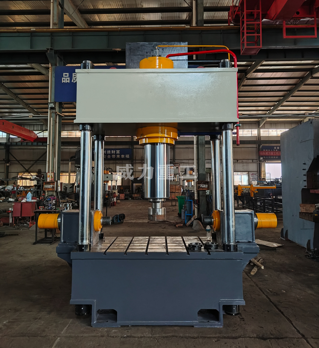 2. 開始工作:通過操縱控制面板上的按鈕,啟動(dòng)液壓系統(tǒng),液壓缸開始運(yùn)動(dòng),上梁向下施加壓力。